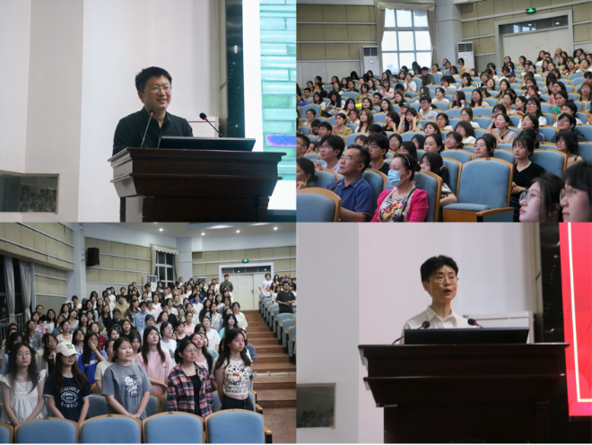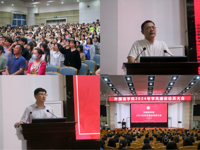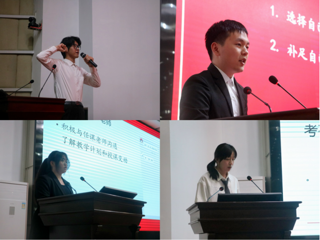 在经验分享与交流环节中,英语(翻译)12201班团支书孙荷昕同学结合自己的学干经历,从“听、想、说、做”四个方面分享了班风建设的经验。“十佳校园明星”、英语(师范)12003班熊佳文同学从自己参与学科竞赛“选、备、赛、思”四个步骤分享了竞赛对自己的帮助。考研先进个人、日语(语言)12001班纪嘉祺同学则通过分享自己的考研心路历程,鼓励同学们奋斗努力比结果更加有意义。2008级优秀员工陈阳博士以“做一名老员工中的六边形战士”为题,从个人成长经历、“外语+”的思考和大学学习建议三个方面建议同学们要注重德智体美劳的深度融合和全面发展。
