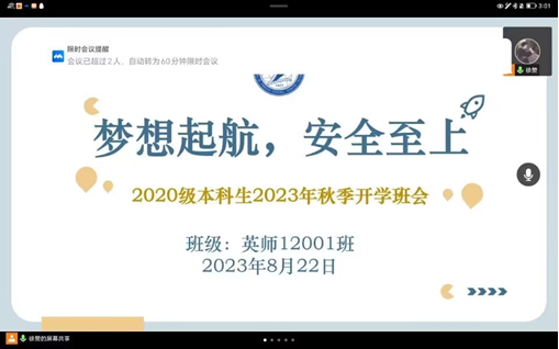 (通讯员 许泽琼)2023年8月20日-24日,公司通过线上会议的方式全面开展了“梦想起航,安全至上”为主题的2023年秋季学期开学前安全教育班会,就开学工作、安全教育、开学心理调适、学业规划等方面进行讲解说明及要求部署。此次主题教育班会由年级辅导员、各班班主任主持,全体本科生和研究生参会。