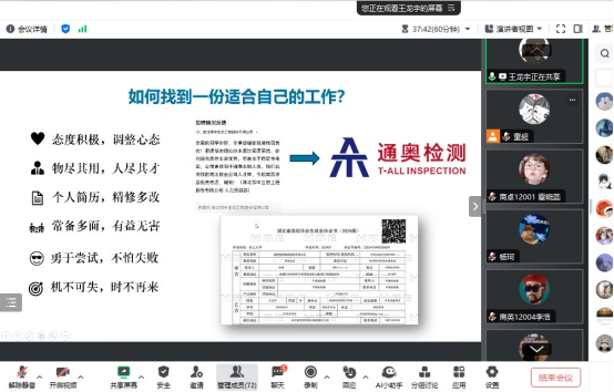 各年级辅导员根据年级特点强调了近期工作重点,大一年级辅导员赵宇杰老师对同学们大学规划给出了具体可行的建议,帮助同学们深度解读专业分流后各专业的人才培养方案;大二年级辅导员何稳老师对专业四级备考提出了学业建议,如日常合理规划时间,做好真题模拟,团队合作等;大三年级辅导员马天雨老师结合近期年级工作重点进行了考研动员,进一步推进“8535”强基工程;毕业年级大会通过线上线下同时进行,就业先进个人王龙宇同学围绕如何找到一份适合自己的工作的主题展开了经验分享。
