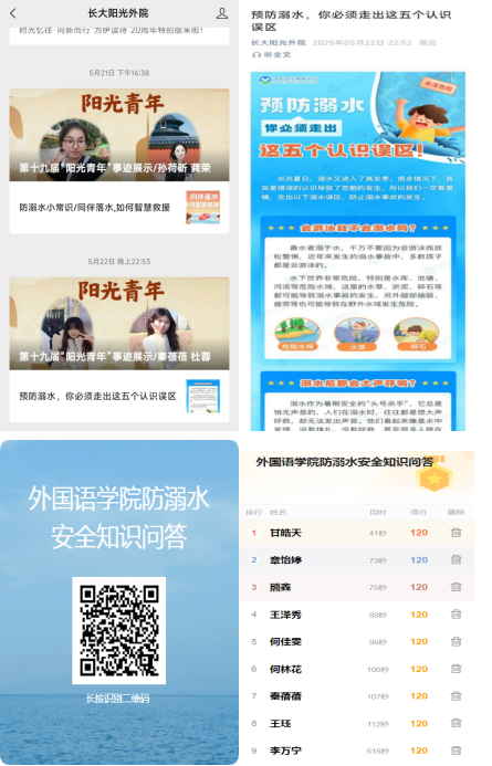 5月26日,学院召开防溺水专题会议,通报了当前防溺水安全形势,布置防溺水安全教育内容和责任分工。假前,各班在线下召开安全教育班会,班主任通过播放防溺水教育视频、分享典型事故案例,带领员工逐条学习防溺水“六不准”要求,并结合划船、漂流等水上活动安全注意事项,强调选择正规场所、穿戴救生装备的重要性。在线上,学院依托QQ群、微信公众号等平台,定期推送防溺水安全知识、警示案例及假期水域风险预警,并通过“同题共答”线上答题活动,强化防溺水安全知识巩固。