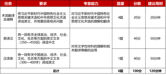 (1)比赛内容:笔译赛题考查汉英互译能力,涉及经济建设、政治建设、文化建设、社会建设和生态文明建设等领域的重要讲话,涵盖习近平新时代中国特色社会主义思想核心内容,包括语言基本能力考查、习近平新时代中国特色社会主义思想关键术语和中华思想文化术语的翻译及阐释、中国时政文献语篇翻译、文学作品选篇翻译、译后编辑、新闻编译等。部分赛题素材选自《习近平谈治国理政》第一卷、第二卷、第三卷、第四卷和党的二十大报告等。
