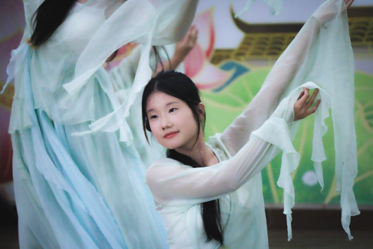 汇演环节中,历史剧《屈原》、朗诵《感恩》、英文歌曲演唱等节目接连上演,生动展现支教教学成果;志愿者编排的楚舞《窈窕淑女》尽显荆楚文化韵味,毛家港镇居民带来的舞蹈《看山看水看中国》、非遗展演《采莲船》及民乐合奏《南湖红船》等节目,则巧妙融合新农村建设风貌,为现场观众送来夏日清凉。