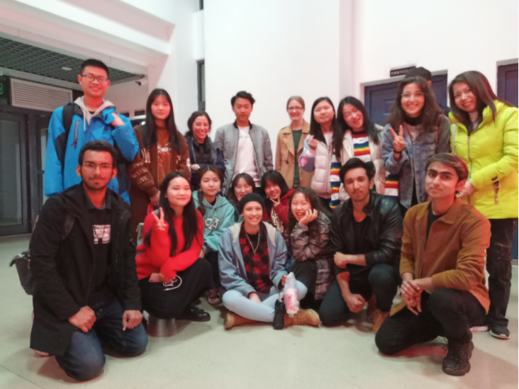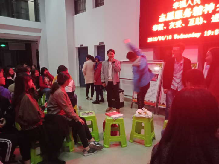 活动进行至五十分钟时,,主持人宣布进入游戏环节。在场的同学和外教老师们都积极参加,根据主持人的提示将提示内容通过肢体语言传递给下一个同学。台上,参加游戏的同学和老师们做出一个个有趣的动作,生怕因为自己的动作不够生动形象使下一个参与者无法理解。有几个同学独创的“大猩猩”姿势更是让大家忍俊不禁。台下,同学们认真的看着参赛同学的表演,跟着一起猜提示词的同时又被台上同学的滑稽姿势逗的前仰后合。