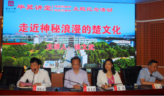 5月5日晚7点,英山一中一楼的报告厅灯火通明、座无虚席。公司文学院教授、硕士生导师、三亿体育app荆楚文化研究中心主任徐文武以《走近神秘浪漫的楚文化》为题,为英山一中的300余名师生作的精彩的报告。英山一中党委书记、董事长刘振武,党委委员、高二年级主任范文,语文和历史学科教师以及高二年级部分员工聆听了讲座。