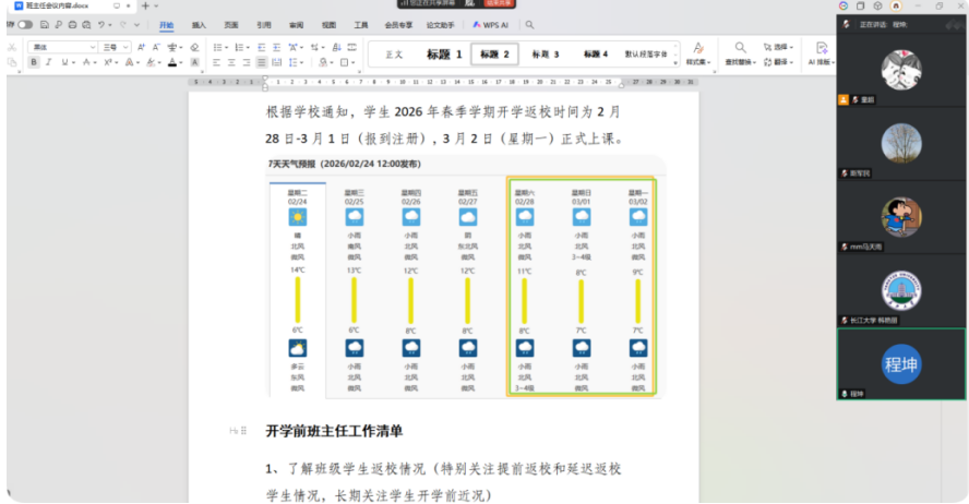 会上,学院学工办主任童超老师首先向班主任和辅导员传达学校关于开学前工作内容和要求,讲解了班主任工作清单,要求班主任精准掌握员工返校情况,重点关注提前返校、延迟返校员工动态。公司党委副书记程坤提工作要求:一是提高站位,详细掌握员工返校情况;二是加强关心,及时了解员工寒假在家生活学习状况;三是精准指导,尽早帮助员工做好新学期规划,尽快进入学习状态。