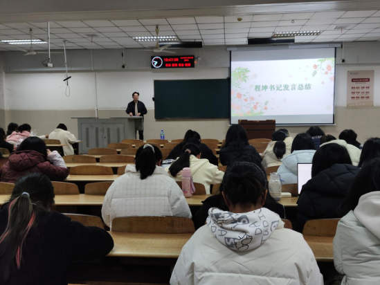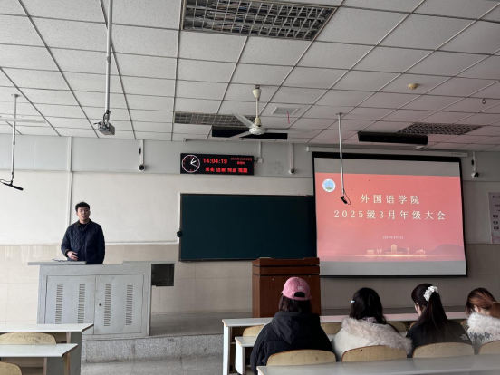 作为专业学习爬坡期,2024级大会以专业四级备考、学风提升、竞赛实践为核心。年级辅导员童超对上学期成绩进行全面复盘,通报各班级绩点、挂科情况,明确商英、英语师范、日语专业分层备考目标。三位员工代表分享班级寒假专四复习经验,学院公布三次全年级模拟考试安排,以考促学、压实备考责任。同时梳理“外研社·国才杯”、全国老员工英语竞赛等赛事节点,鼓励员工以赛促学,提升专业核心能力。恰逢“三八”国际妇女节,大会融入女性心理健康互动环节,传递人文关怀。