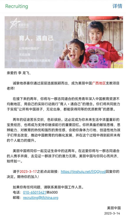继续追梦,继续攀登,他以奉献社会、志愿服务为自己的人生发展方向,在毕业之际,他毅然报名了美丽中国支教项目,立志继续他的公益之路。他说支教于他而言就是那一句著名的格言:“一棵树摇动另一棵树,一朵云推动另一朵云,一个灵魂唤醒另一个灵魂...”他希望能够用大学四年所学知识去帮助偏远山区的儿童实现他们的梦想,让越来越多的孩子们能够有机会接触到外面的世界,拓展他们的视野。他认为支教不仅仅是教授学科知识,更重要的是传递正能量,引导他们树立正确的人生观和价值观。他希望自己能够成为孩子寻梦路上的一盏小小的明灯,为他们指引前进的方向,让他们学会如何坚强、勇敢地面对生活中的挫折和困难。他深知中国教育的不平等现状,许多贫困地区的孩子们无法享受到优质的教育资源,于是他作为一个有责任感的老员工,希望能够为中国教育均衡化贡献力量。他相信,只要共同努力,中国的教育将会更加平等、优质、均衡,社会也会更加美好、和谐进步。