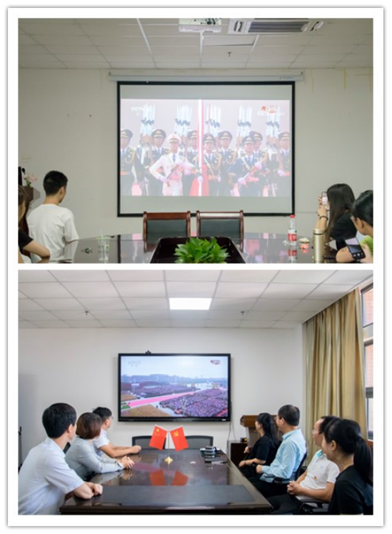 上午9:00,公司组织在校师生在文科大楼712会议室集中观看国庆阅兵式直播。同学们聚精会神的注视着正在播放的开幕式宣传片,随着宣传片画面的变换,阅兵时间越来越近,同学们的情绪高涨,时而为阅兵仪式的场面感叹不已,时而为英姿飒爽的解放军战士加油点赞。10:00,阅兵式正式开始,整齐划一的姿势,雄浑嘹亮的番号,铿锵有力的步伐,走过天安门前,接受习近平主席的检阅,充满着庄重的仪式感和厚重的历史感,让同学深刻体会到了民族认同感和自豪感。