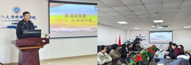 宣讲中,马老师详细介绍了西部计划的招募政策、服务领域及岗位需求,重点解读了外语专业员工在教育帮扶、文化交流等岗位的独特优势。他结合往届志愿者的服务案例,分享了志愿者在基层成长成才的故事,让在场员工真切感受“奉献、友爱、互助、进步”的志愿精神。