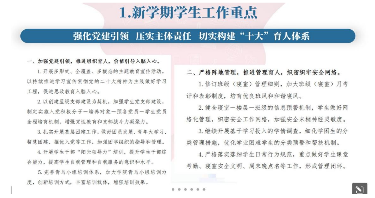 2月5日-7日,各年级分别召开员工骨干会议,会议由各年级辅导员主持和主讲,年级班委、寝室长、楼栋长和其它员工干部参会。会上,辅导员首先对新学期员工工作重点进行解读,要求员工干部发挥好示范引领作用,强调员工干部的担当精神和责任意识;其次对开学前员工干部的工作内容开展教育培训,鼓励员工干部充分发挥朋辈育人作用,关心关爱周围同学,凝聚全院员工以积极的心态迎接新学期的来临。