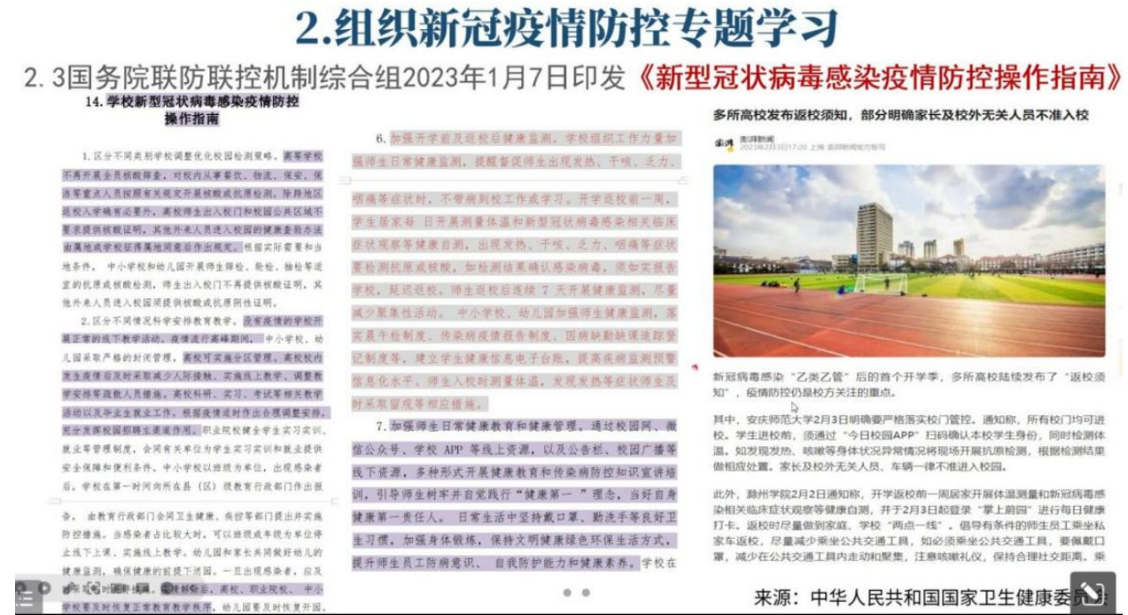 2月4日-5日,各班组织召开开学前安全主题班会,班主任在会上详细宣讲了返校报到的具体条件和流程,强调先申请后到校,非批准不返校;然后,班主任们组织员工重点学习了国务院联防联控机制综合组2023年1月7日印发的《新型冠状病毒感染疫情防控操作指南》,强调学校疫情防控要求,提升员工健康安全责任意识;最后对返校后的开学考试纪律要求及学习生活也进行了提示。
