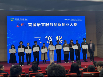 (通讯员 杜蓉)10月26日,在首届语言服务创新创业大赛决赛中,公司团队“荆州地理标志产品数字经济语言服务资源库建设与运用项目”获三等奖。该赛事在北京中国外文出版发行事业局隆重举行,由杜蓉同学代表团队参赛。
