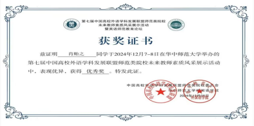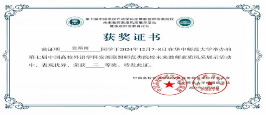 (通讯员 张斯雨)为全面提升师范类院校员工英语教学技能和教学水平,推动未来卓越英语教师综合素养的培养,发挥职前教师教育的引领示范作用,由中国高校外语学科发展联盟主办,华中师范大学承办的“第七届中国高校外语学科发展联盟师范类院校未来教师素质风采展示活动”,于12月8日成功落下帷幕。在此次盛会中,三亿体育鲁志荣老师悉心指导的22级员工张斯雨同学荣获二等奖、肖贻之同学荣获优秀奖,展现了公司学子的卓越风采。