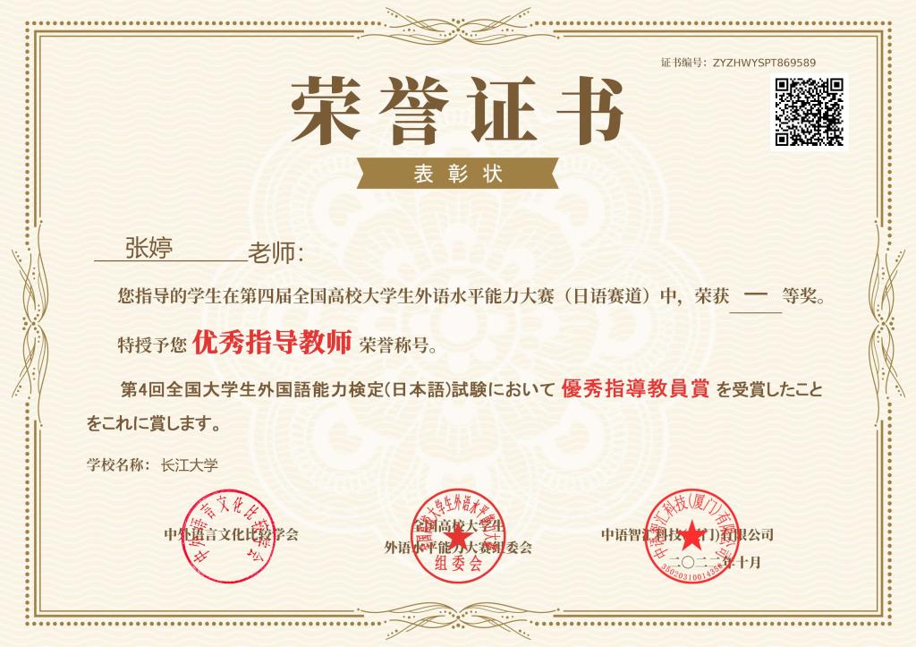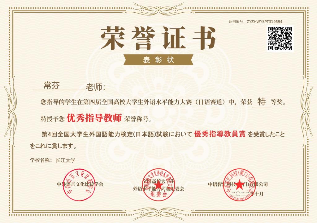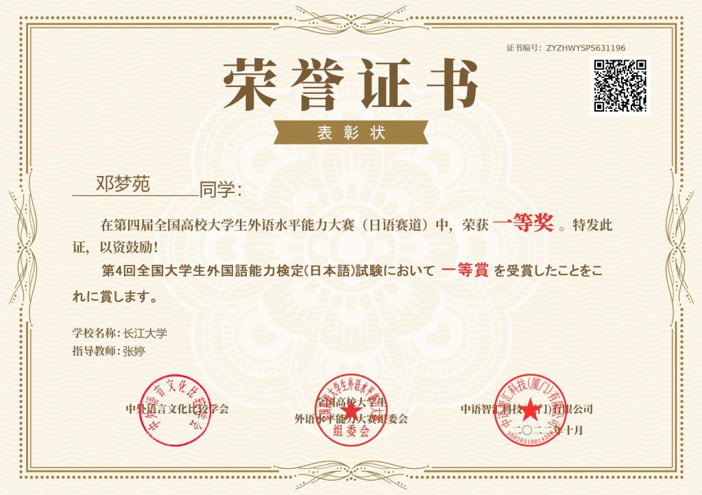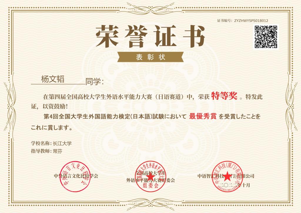 (通讯员 李福兴)11月22日,第四届全国高校老员工外语水平能力大赛-日语赛道决赛落下帷幕。三亿体育日语系12101班杨文韬同学以172.6分的佳绩斩获全国第二名,荣获特等奖,带队老师常芬获评优秀指导教师。三亿体育日语系辅修班12101班邓梦苑同学荣获一等奖,辅导老师张婷获评优秀指导教师。