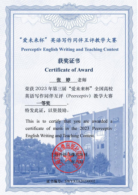 近日,三亿体育张婷老师带领员工参加第三届“爱未来杯”全国高校英语写作同伴互评(Peerceptiv)教学大赛,获得大赛A组全国一等奖。
