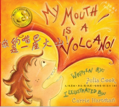 本次“绘声绘色”活动选取的绘本为My Mouth Is an Volcano(《我的嘴巴是一座火山》)。故事主要讲述的是:小男孩路易斯非常喜欢表达,认为所有的想法都对他很重要,以至于在谈话中经常打断别人。当他有话要说时,话语就从他肚子里跑出来,舌头将他所有重要的话语推到他的牙齿上,突然爆发,打断了别人的谈话。他的嘴就像是一座火山。通过阅读绘本,引导孩子避免打断别人说话,通过倾听和等待轮到他们发言来教育孩子尊重他人的价值。绘本生动形象地把张口即来不顾他人感受的习惯比作火山喷发,十分幽默的表达也易于让小朋友们接受和理解。作者库克Julia Cook是全国获奖儿童作家兼育儿专家,他具有通过故事书进入儿童世界观的天生能力,为孩子们提供说什么和怎么说的方法。