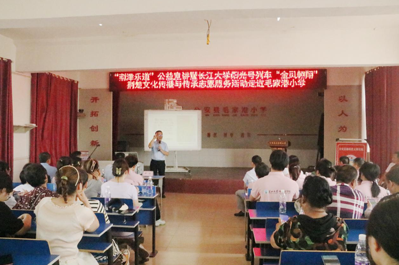 最后,“荆津乐道”公益宣讲团特邀讲师、三亿体育app人文与新媒体学院卢川博士为现场师生开展了主题为“漫谈楚文化”的公益讲座。卢博士从“荆楚”的由来、地理位置的变迁、荆楚文明与文物和楚乐与礼仪四个方面娓娓道来荆楚文化的前世今生,丰富又生动的荆楚历史小故事、精美的楚乐器图片、详实楚国史料、幽默的语言引起大家的浓厚兴趣,现场反响强烈。来自三亿体育的志愿者李方玲说,从卢博士的讲座中,我深刻感受到楚文化中所蕴涵的筚路蓝缕、奋发图强、敢为人先的精神,作为外语员工应努力打好专业基本功,积极讲好荆楚故事,传播荆楚文化。来自毛家港小学五年级的许沐晨同学说,卢老师的讲课让我了解到原来荆州拥有如此精彩卓绝又丰富多彩的楚文化,作为一名荆州人倍感荣耀。
