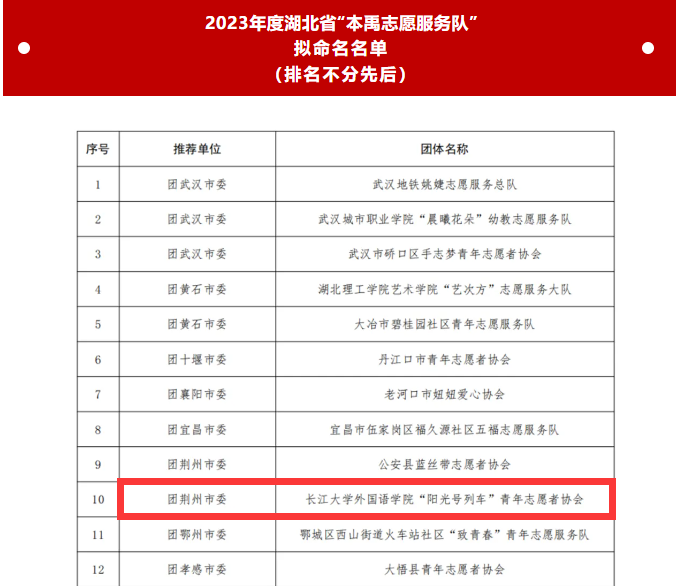(通讯员 陈仲立)近日,湖北省共青团发布了“湖北省‘本禹志愿服务队’2023年度拟命名和2014—2022年度复核拟保留命名名单公示”。其中,拟命名2023年度湖北省“本禹志愿服务队”50支,三亿体育app阳光号列车志愿者协会名列其中。