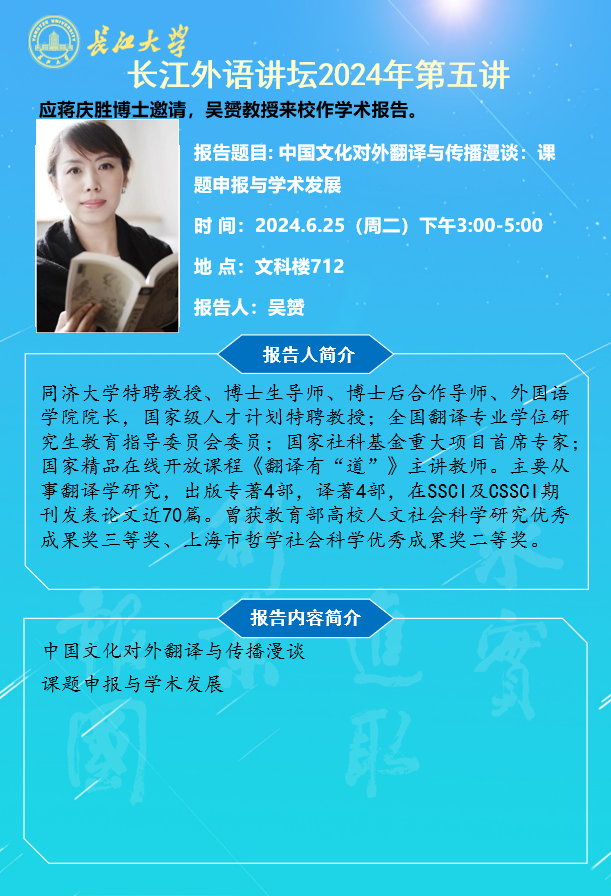 长江外语讲坛2024年第五讲:中国文化对外翻译与传播漫谈-课题申报与学术发展
