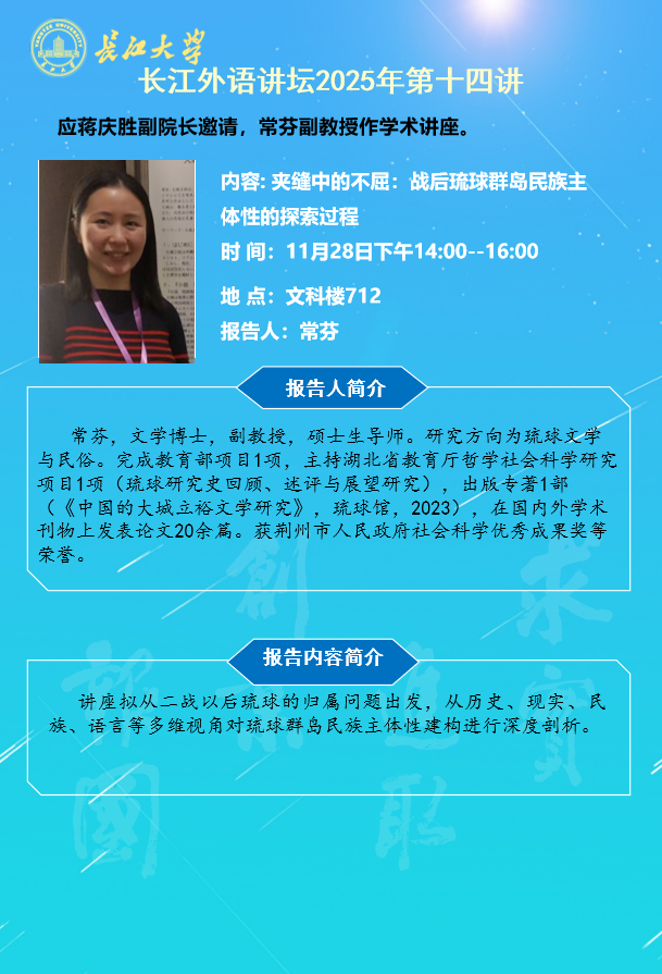 长江外语讲坛2025年第十四讲:夹缝中的不屈:战后琉球群岛民族主体性的探索过程