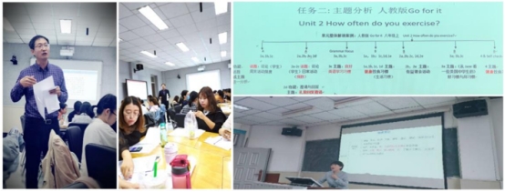工作坊主要围绕昨天专家引领的主题:单元整体文本解读。谢家成和谈宏慧两位老师分别指导两个班学员,通过互动,一步一步共同探讨人教版初中英语8年级上册第2单元“How often do you exercise?”各个文本的内容及主题意义,梳理整个单元的主题意义探究,并在此基础上,设定单元教学目标。解读过程中,也对部分具体文本展开了从主题、内容、语篇体裁和语言等全方位的文本解读。其间,学员们与指导教师、学员与学员之间多方互动,形成了思想碰撞,进一步体验和实践了单元整体下的文本解读。