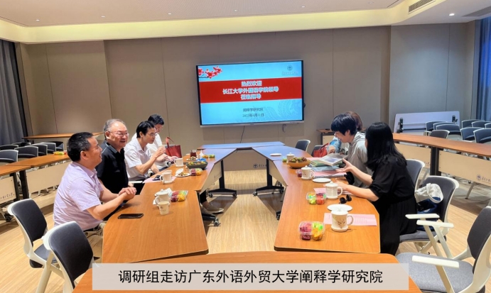6月11日下午,调研组走访了广东外语外贸大学阐释学研究院,该院是我国阐释学研究的重要基地,在该领域有较高的学术影响力。阐释学研究院经理陈开举教授热情接待并详细介绍了阐释学的概念内涵和发展历程。他还生动地解读了荆楚文化的内涵,使调研组老师对阐释学及区域文化有了更深入的理解。双方探讨了共同建立“阐释学与荆楚文化研究”课题的可行性。广东外语外贸大学国际商务英语学院徐章宏教授、肖武东老师和阐释学研究院博士后殷立飞也应邀出席座谈。调研组与各位专家就英语专业的人才培养目标、就业情况、跨文化课程开发、访问学者项目等议题进行了深入的交流探讨。