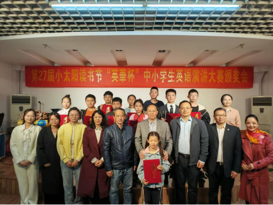 (通讯员 王娟)11月9日下午,荆州英华书院举办“第27届小太阳读书节‘英华杯’中小学英语演讲大赛颁奖会”。公司党委书记周杰、英语系主任王娟及卓越师范班的余桦、杜蓉、罗彤员工受邀参会。荆州市图书馆副馆长汤军、荆州英华书院董事长王景辉等领导及家长、员工代表也参与了此次盛会。