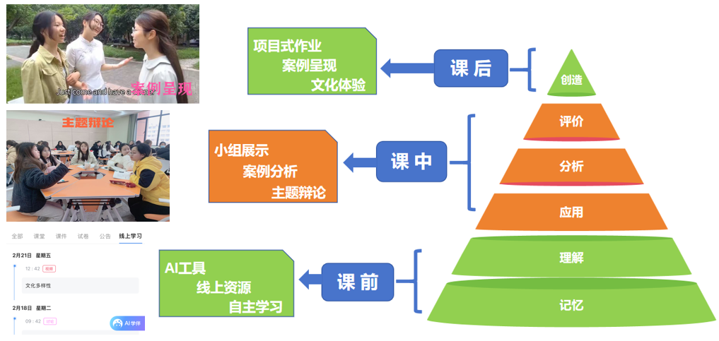 为破解“文化解码”与“教学转化”的认知断层,课程通过“三环联动”教学法(课前线上自主学习、课中小组深度研讨、课后项目式实践)深化教学实效。课前员工借助AI工具完成文化现象的再认,课中通过小组辩论、角色扮演等活动应用理论,课后则以教案设计、案例呈现等形式输出能力,形成“输入-内化-输出”的闭环。